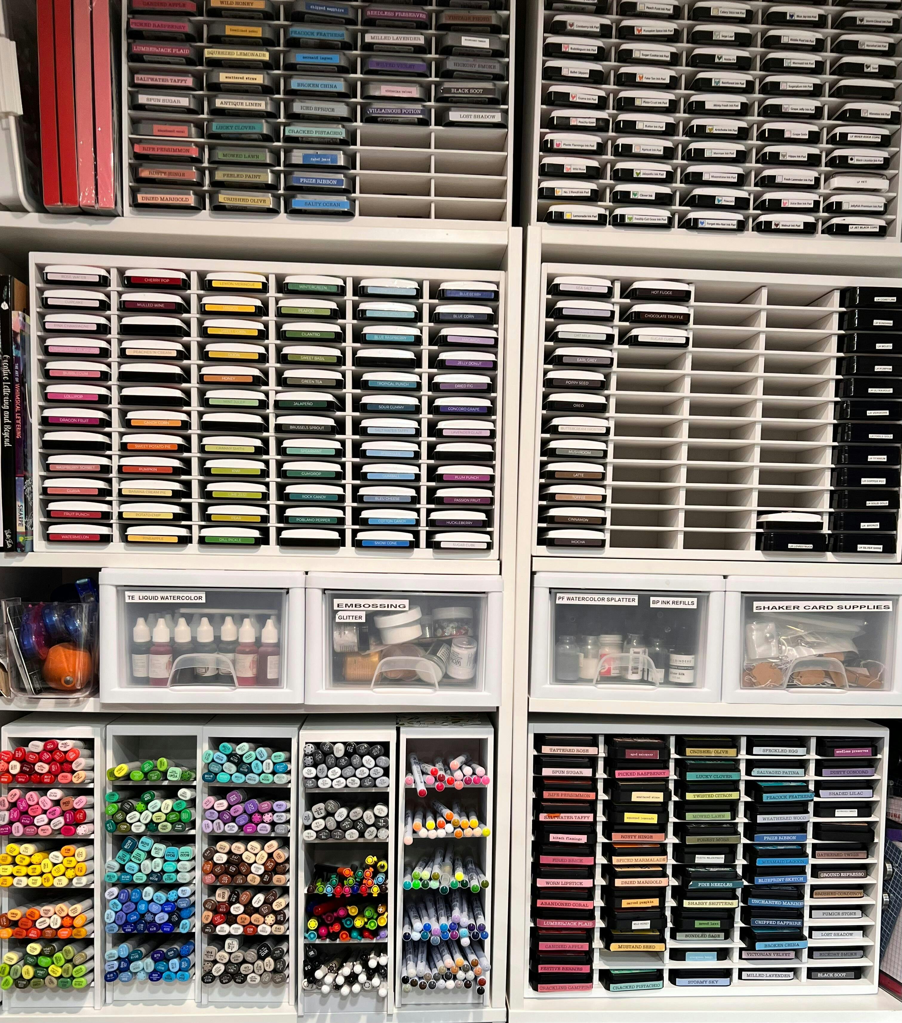 Our largest standard ink had holder is the perfect way to store 72 of the most popular ink pads including: My Favorite Things, Simon Says Stamp, Distress, Avery Elle Pigment, Hero Arts, Lawn Fawn, Catherine Pooler Designs, and more! Whether you decide to hang it on the wall or sit it on a desk, this organizer will perfectly hold your ink pads to create a clean and organized look. (Please note, this organizer will not accommodate Stampin Up or the CTMH pads.)