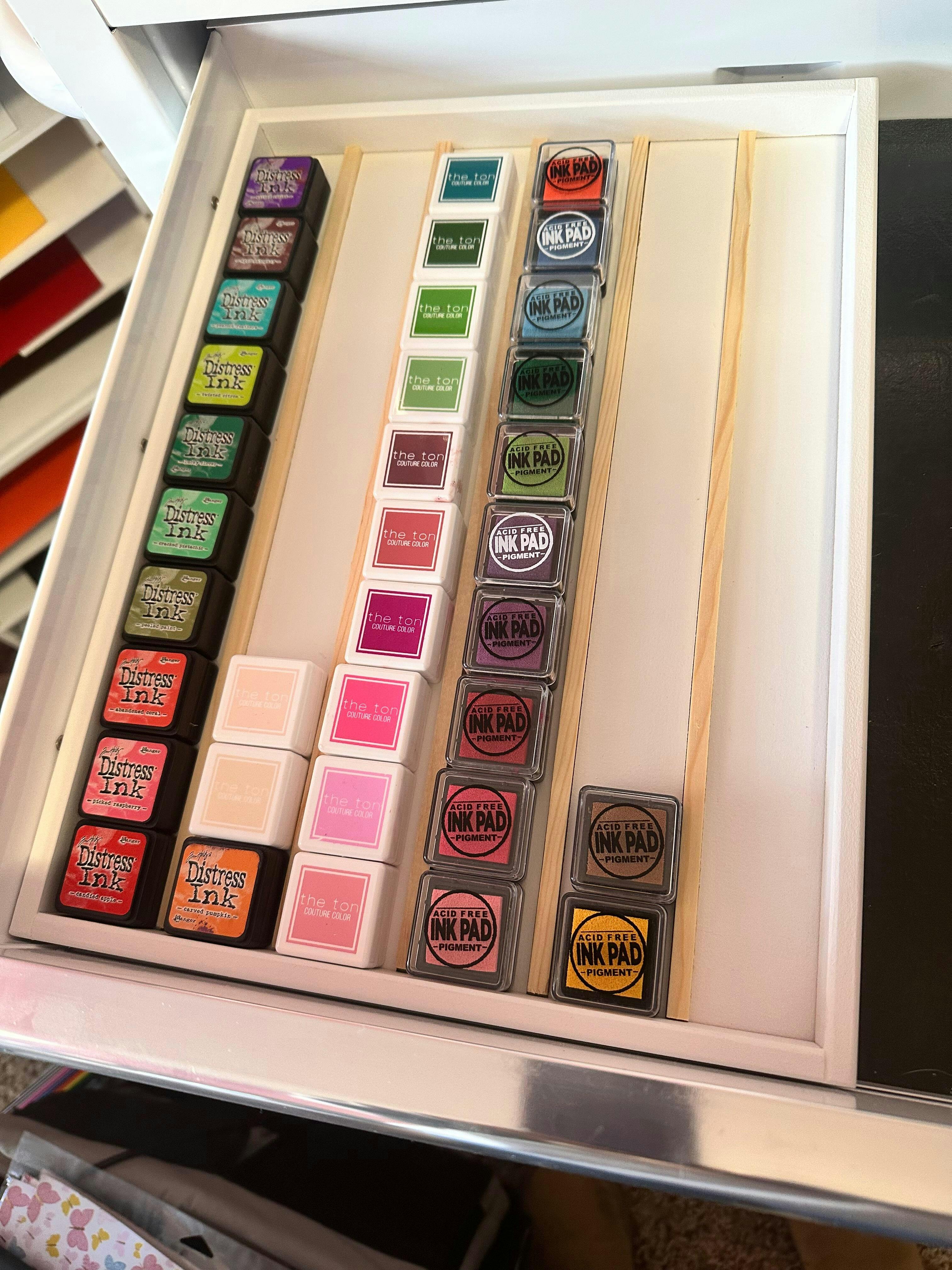 This Mini Ink Tray holds up to 60 mini ink pads. It's divided into 6 columns and designed to fit perfectly into the Ikea type 6 or 9 drawer cabinet. The caddy is made from all wood so, it's lightweight but very durable. Plus, this caddy is stackable!